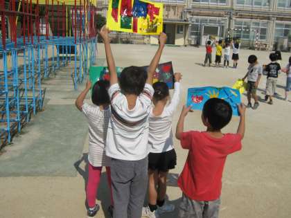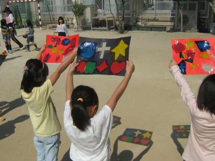 自分が切り抜いた形に色がついて、とてもきれいに見えます。運動場で、地面にその形を映して楽しみました。カッターナイフを使うのは少し難しいところもあったけれど、出来上がった作品は、どれも素敵です!!