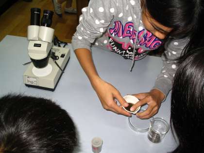 今日は,火山灰の中にどのようなものがふくまれているのか,顕微鏡で観察しました。火山灰をお米を研ぐような要領で洗ってから顕微鏡で見ると,透明,赤色,金色などなど,色とりどりの粒を見ることができました。黒い火山灰から思いもよらないもが見られ,「宝石みたい!」とおどろきの声をあげていました。