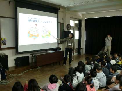 11月5日(月)に,京都市環境政策局とまち美化事務所から,6人の方々がきてくださいました。クイズや見やすいスライドを通して,エコライフの大切さや,迫っている環境破壊・地球温暖化の脅威などについてお話くださいました。お話では,このままの状況が続くと,地球上の平均気温は100年後に,最大6.4度の上昇が予想されるとのこと。そうなると,今の地球上の生物のほとんどは生きていけなくなるそうです。大変なことですね。