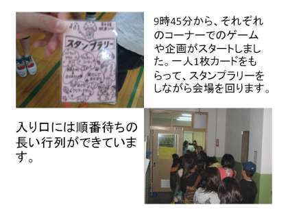 今日は、学校でPTA主催の「みんなあつまれ 秋まつり」を開催しています。朝早くからたくさんの子ども達や保護者の方にお越しいただき、土曜日ですがとってもにぎやかな学校になっています。講堂や教室では楽しいコーナーがたくさんあり、子ども達に大人気です。