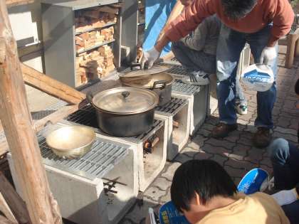 廃材で作った野外炊事場で,カレーをたきました。