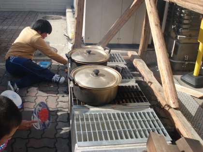 夏休みに,1年生の教室改修をするときに出た廃材を使って建築した「金閣セントラルガーデン(野外炊事場)」で,完成してはじめてかまどを使って野外炊事をしました。