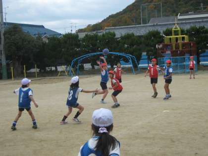 子ども達は、チームで得点を競い合うようなボールを使った運動が大好きです。じっとしていると、外はもう寒いぐらいですが、みんな一生懸命動いて、声を出して、学習が終わった後は汗をかいていました。