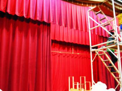 後ろ幕のはずれているところや,緞帳の上校章がついている前幕のはずれているところも直して頂きました。