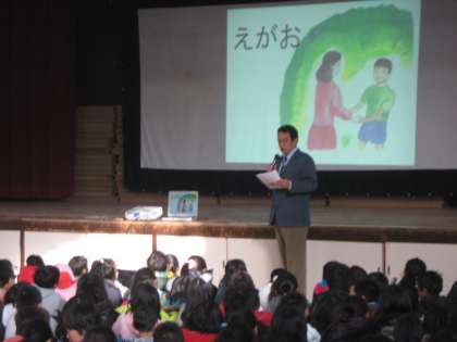 金閣校では毎月1日に講堂で朝会を行っていますが、今月は世界人権デーに合わせて、今日朝会を実施しました。校長先生が、スライドを使いながら「笑顔」というお話をしてくださいました。友達を大切にすることや、本当の優しさについてのお話です。自分のまわりの人を自分と同じだけ大切にできる人になれるように、教室でも、家庭でも、話し合ってみてほしいと思います。自分のしていることや言っていることが人を悲しませてしまっていないかどうか、しっかりと考えることができる人になってほしいです。