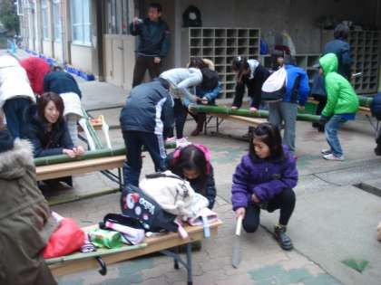 約80名の小学生と保護者のみなさんで,竹を切ってかわいい門松を作りました。