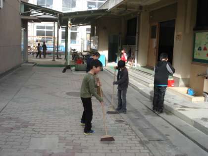 金閣小学校では,児童数の割に校庭が狭く,掃除場所もあまり多くありません,一つの掃除場所に割り当てられる児童の数も複数です。