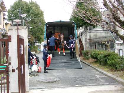 13時25分 金閣小学校に平安騎馬隊の「馬運車」が到着し,6年生が出迎えました。