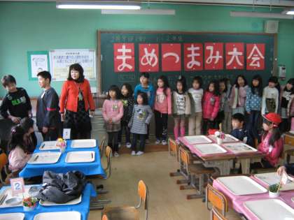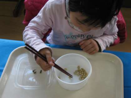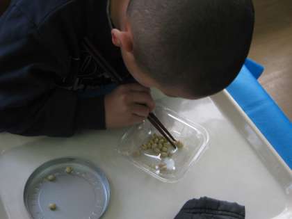 金閣校では、2月1日から15日までを給食週間として、いろいろな取組を進めています。今日は、中間休みにランチルームで低学年の豆つまみ大会を実施しました。各学級の代表の子ども達が、つまみにくい大豆を一生懸命つまんでいました。正しいお箸の使い方について意識できるように、普段から心がけてほしいです。12日には中学年、15日には高学年の部を実施します。