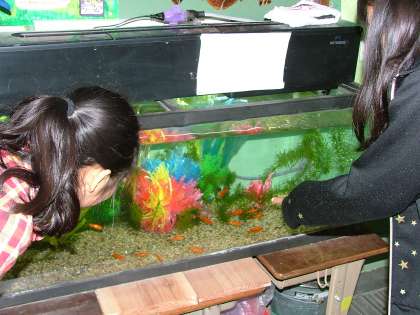 赤い小さな金魚が集まって泳いでいる中に,体の一部が少し黒い金魚が混じっていて,子どもたちは「スイミーみたい。」と言って,楽しんでくれています。