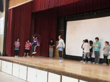 毎日の掃除の時間と並行して進めてきた体力作りの取組である「きらきらタイム」の発表会を実施しました。今回はにじの子学級・1年・3年・5年の発表です。縄跳びやマット運動などの練習の成果を子ども達が舞台の上で発表しました。難しい技に挑戦した子どももいて、講堂は歓声と拍手に包まれました。