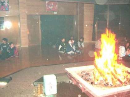 キャンプファイヤーの様子です。雨が降っていたので,プレイホールでの活動になりました。楽しみました。