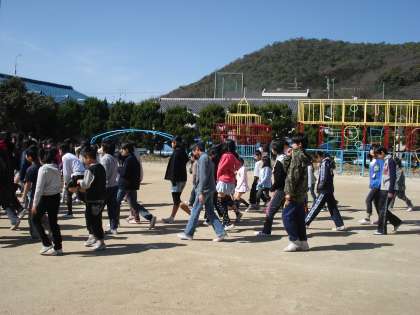 子どもたちには,京都市南部に大きな地震がおこったことを想定して,避難訓練をしました。