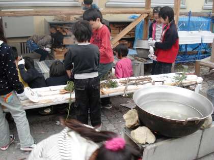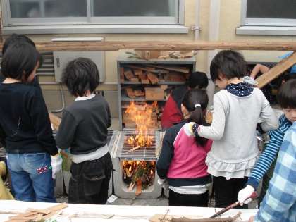 今年度,中庭に作成した野外炊事場「きんかくセントラルガーデン」で,