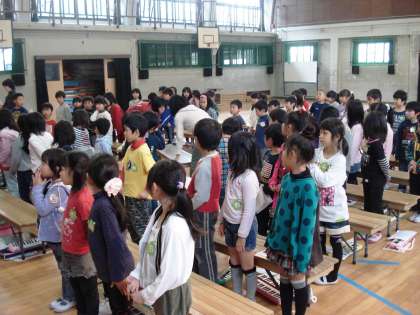 6年生と5年生が,卒業式の練習をしているあいだに,1年生が入学式の練習とお迎えに言葉の練習をしています。