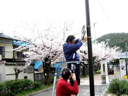 午後は,校門前の通路に大きな時計を取り付ける作業をしました。
