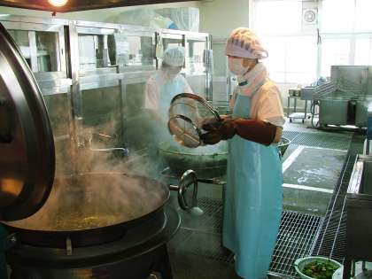 金閣小学校では,朝から4人の給食調理員で,「 600人分 」の給食を作っています。