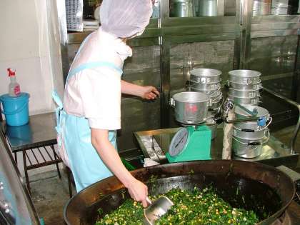 金閣小学校では,朝から4人の給食調理員で,「 600人分 」の給食を作っています。