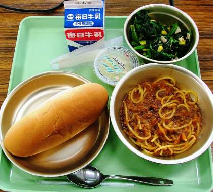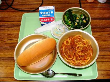 今日の給食の献立名は「スパゲティーのミートソース煮・ほうれん草のソティー・小型コッペパン・牛乳・りんごゼリー」です。