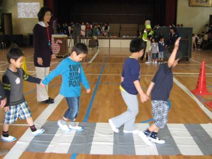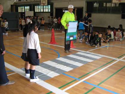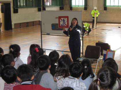 3校時に北警察署の交通課の方にお越しいただき、1年生のための交通安全教室を行いました。道を歩くときは、歩道や路側帯を通ること、右側通行で歩くこと、交差点では左右をよく見てから渡ることなど、わかりやすく教えていただきました。そのあと、講堂に作られたコースを安全に歩く練習もしました。校区内には車の多い道や見通しの悪い交差点もあります。明日からも交通安全に気をつけて、毎日元気に登下校してほしいです。