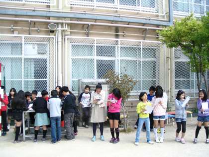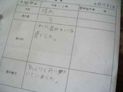 最初の授業で,天気は「雲の量によって決まる」ことを学習しました。今日から3日間,午前と午後の雲の様子を観察し,天気の変化について調べていきます。「雲の量は?雲の形は?雲の動きは?」と観察の視点をしっかりもち,観察することができています。