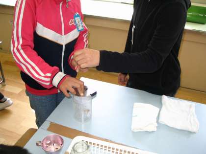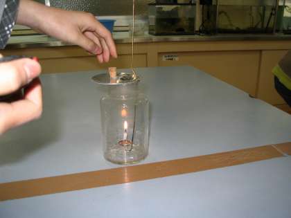 今日は「びんの中に火のついたろうそくを入れてふたをすると,どうなるか?」を実験で確かめました。結果は,だんだん火が小さくなって,最後は消えました。大きさのちがうびんで比べると,大きいびんの方が,燃えている時間は長いという結果でした。