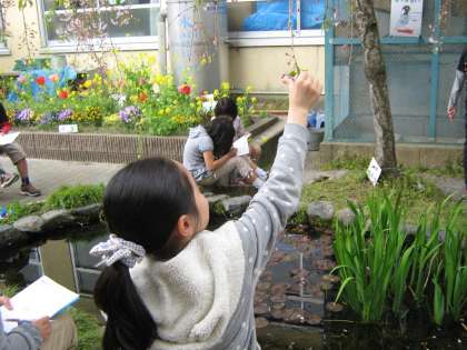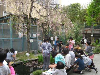 4年生の理科の最初の単元は、「季節と生き物(春)」。校内の生き物の様子を観察して、その成長の様子について調べる学習です。だいぶ散ってしまったけれど、それでもまだひょうたん池のシダレザクラには花がついています。