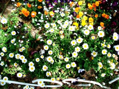 東門の北側花壇の「ノースポール」がいっぱいかわいい花を咲かせています。