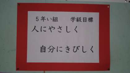 5年い組のクラス目標が決まりました。「人にやさしく 自分にきびしく」 いい言葉ですね。このめあてをもとに,1年間がんばっていきましょう!!!