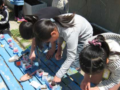 4年生が、空の牛乳パックに土を入れて、種をまいています。まいているのは、ヘチマとツルレイシ。芽が出て大きくなったら、プランターに植えかえて校舎のそばに置き、緑のカーテンに挑戦します。一緒にひまわりとフウセンカズラの種も植えました。