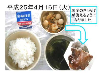 6年ぶりに国産のきくらげが使用できました。「プリプリ中華いため」は,食べた時にいろんな食べもののプリプリした触感が味わえる,子ども達に人気のおかずです。今まではこりこりくにゃっというきくらげの食感が抜けていました。今日からは,初めて登場した時と同じになりました。