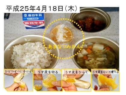 4月18日には,甘夏みかんが給食に登場しました。4月に1回だけですが,旬の食べものとして毎年でてきます。