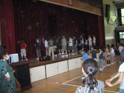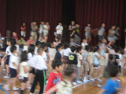 昨日から始めた星グループのきらきらタイム、今日は2回目です。今日は、すでに上手に踊ることができるようになった子ども達が舞台の上にあがって先生役で踊っていました。動きにもキレがあり、とっても上手です。みんなの動きがそろって、ビシッとかっこよく決まるのが楽しみです。