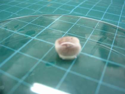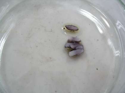 今日の実験では,ヨウ素液を使いました。ヨウ素液はでんぷんがあると,青むらさき色に変化します。半分に切ったインゲンマメの種子の断面に,ヨウ素液をかけるとどうなるかを見ました。数分たつと,断面の色がほんのわずかに黒っぽく変色するのを見ることができました。このことから,種子の中にはでんぷんがあることがわかりました。