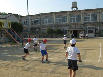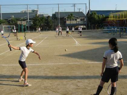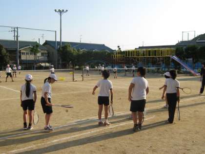 運動場で、部活動テニス部が練習をしています。西日に照らされてとっても暑そうですが、みんな元気いっぱいです。今年度初めての練習ですが、さすがに昨年度も経験している上級生は上手です。初めてラケットを握る人も、負けずにどんどん上達してほしいです。