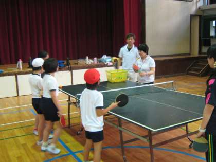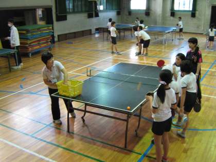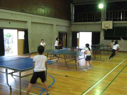 講堂では、部活動卓球部が初めての練習をしています。ラリーが長く続く子どもたちが何人もいて、講堂の中は熱気でいっぱいです。スマッシュがバシッと決まるととってもいい気分です。