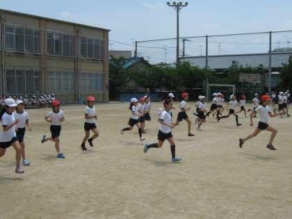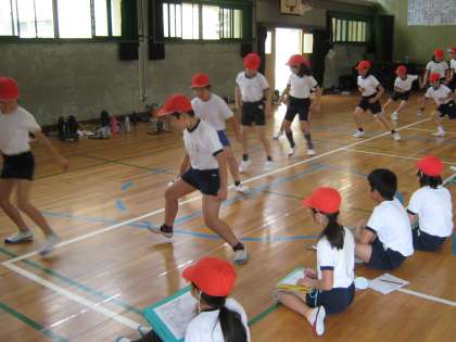 運動場と講堂を使って、5年生が体力テストをしています。今日実施している種目は、「上体起こし」「長座体前屈」「反復横とび」「立ち幅跳び」「ソフトボール投げ」「20mシャトルラン」です。とっても暑い日なので、こまめに水分補給をしています。暑さに負けず、がんばってほしいです。