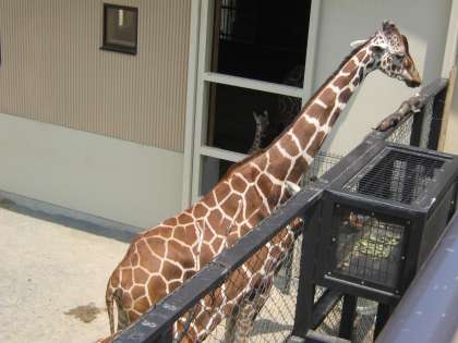 なんとキリンの檻の前に空中廊下が作られて,キリンと同じ目線で目の前で観察できるようになっているんです。しかもよく見るとシマウマまで同じ檻の中を歩いているという……