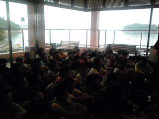 今日宿泊する「鷲羽山下電ホテル」に到着しました。ロビーで入館式をして、ホテルの方にごあいさつをした後、部屋に入りました。このあと楽しい夕食です。