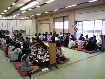 大広間で、夕食の時間です。海老フライに、唐揚げに、コロッケに、お刺身に、小うどんに、鍋物に・・・。すごいごちそうです。みんなでわいわい言いながら食べるごちそうの味は格別です。