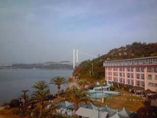 とっても気持ちのよい、爽やかな空気とともに、修学旅行2日目の朝を迎えました。鷲羽山下電ホテルは、瀬戸大橋のすぐそばにあり、客室から瀬戸大橋と瀬戸内海が見えます。外観はピンク色で、ちょっとおしゃれです。プライベートビーチもあります。