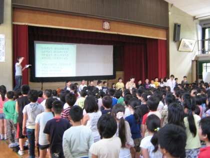今月の歌は、『世界中のこどもたちが』です。全員で歌うのは今日が初めてだったのですが、きれいな歌声が講堂に響き渡りました。