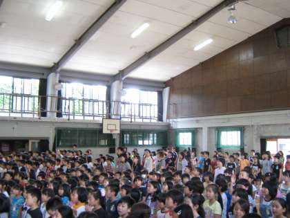 朝会のあと、運動委員会の人が運動場や体育館の使い方について話をしてくれました。集会委員会の人は「全校うたごえ」の取組を進めてくれました。