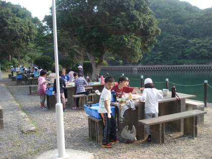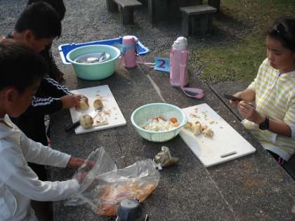 野外炊事は、海辺の野外テーブルで行いました。