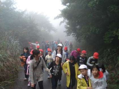 雨の登山で急な場所もありましたが、子どもたちが助け合い声をかけ合って達成しきりました。