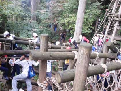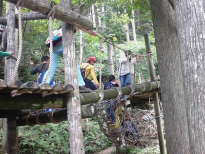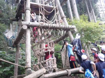 降っていた雨もあがり、最後にみんなで「冒険の森」へ行って遊んでいます。楽しかった花背山の家での活動もいよいよフィナーレが近づいてきています。このあと、お昼ごはんを食べて、退所式をします。