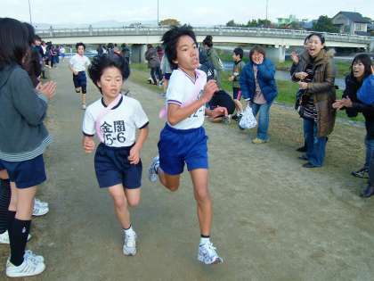 6年生がチームを組んで寒風の中河川敷をたすきリレーして懸命に走っていました。