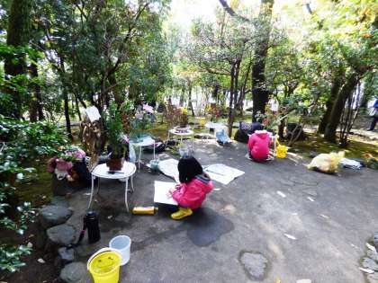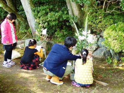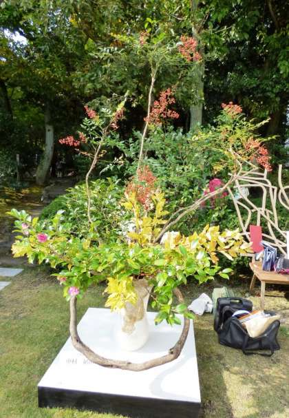 本日から二日間,堂本印象美術館の庭園にて 伝統文化 金閣 生け花こども教室に参加している子どもたちの作品展を,「森の中のいけばな展」として,20名の子どもたちが出品しています。