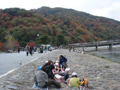 紅葉のきれいな山々を背景に,桂川河川敷でお弁当を食べました。