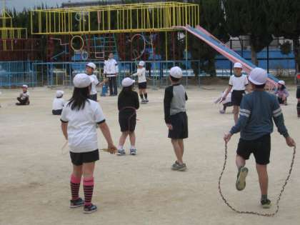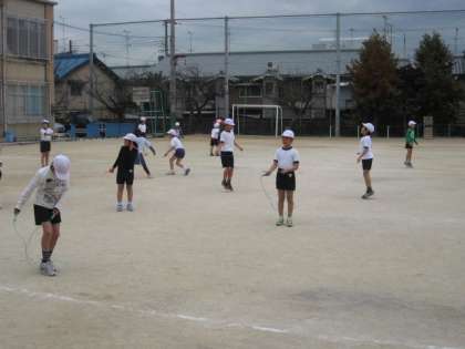 3年生が体育の学習で、運動場でなわとびをしています。なわとびは、体も温まるし、持久力や跳躍力もつくし、冬場の体力づくりにはぴったりです。休み時間や放課後に運動場や中庭でなわとびをしている子ども達もよく見かけます。「あや跳び」や「交差跳び」、「二重跳び」や「はやぶさ」にチャレンジしている子どももいます。これからどんどん寒くなりますが、外で元気に体を動かして体力をつけてほしいです。